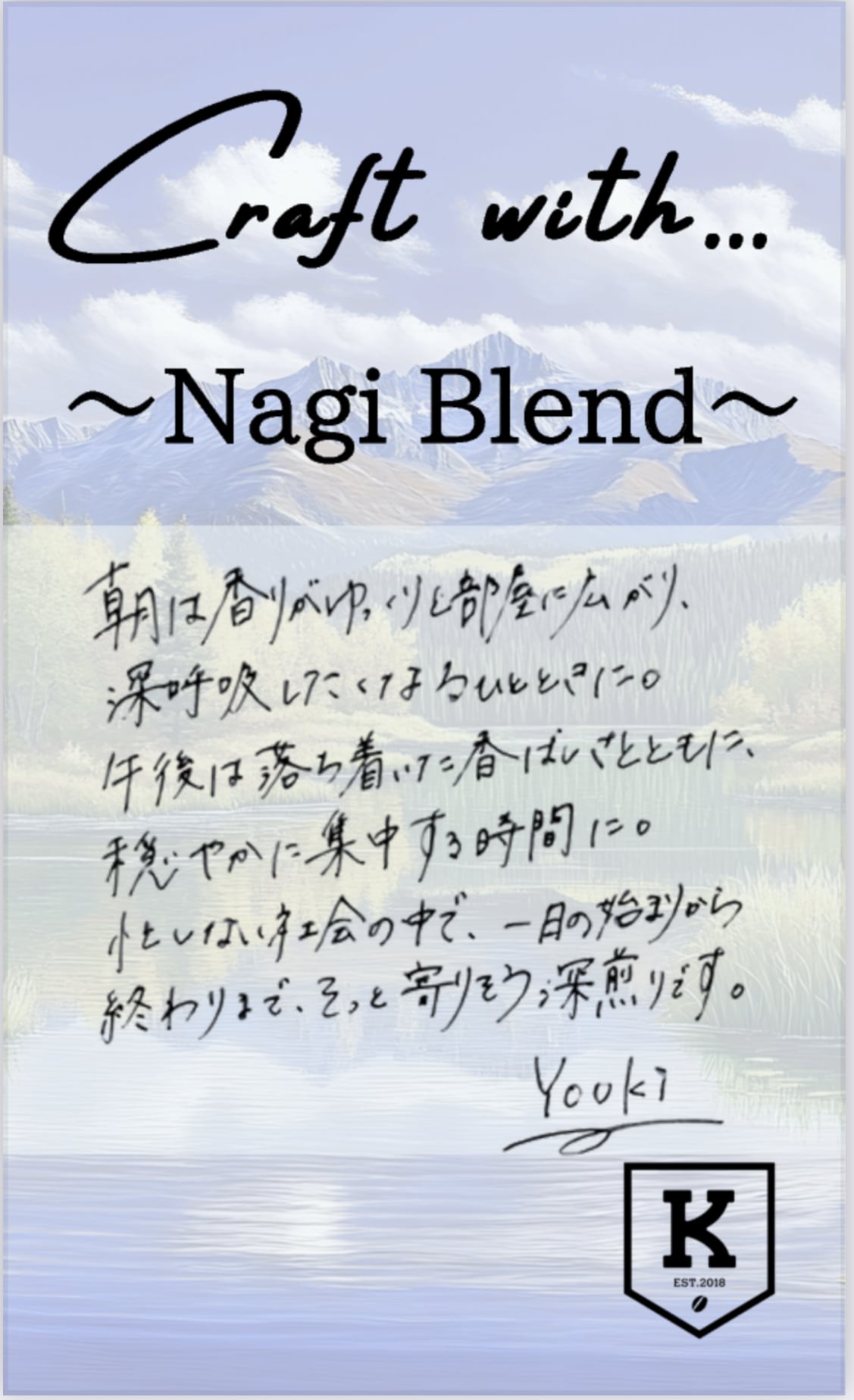 「苦味」「どっしりとしたボディ」「香ばしく時にスモーキーな香り」などのイメージが一般的ですが、この「Nagi Blend」はそんなイメージを覆す「華やかで豊かな香りも楽しめる、優しい深煎りコーヒー」を皆様に体験していただきたい、という思いで作成しました。